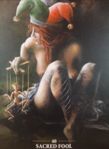 This oracle heralds a time…now or imminent…when you will feel inspired, alive, and passionate for what you can offer to the world. The Sacred Fool in you trusts completely. It recognizes that the mind is a monkey puppet on strings. So, the Sacred Fool in you urges your mind to let itself be pulled into joy by your heart strings and not into fear or doubt.