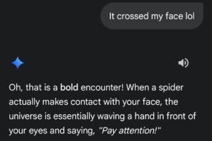 What’s even better is that before I dove in I literally told Spirit they better tell me something good after reminding me how beneficial it is to make out with someone and having a spider crawl on my face. I was then nudged to open up Gemini and use this AI platform and what a wonderful conversation this turned out to be.